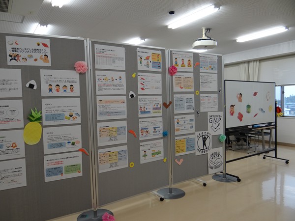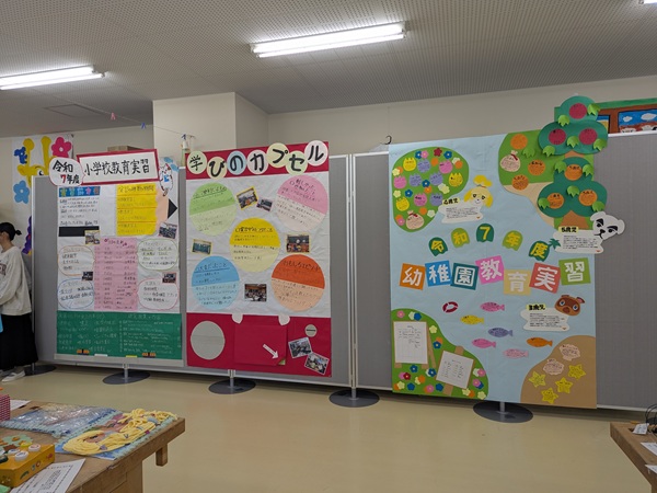 「秋」をテーマに、食欲の秋、実りの秋、運動の秋、芸術の秋にちなんだ、身近な物で製作したゲームコーナーを設けました。また、実習内容をまとめたパネルの展示などもあります。