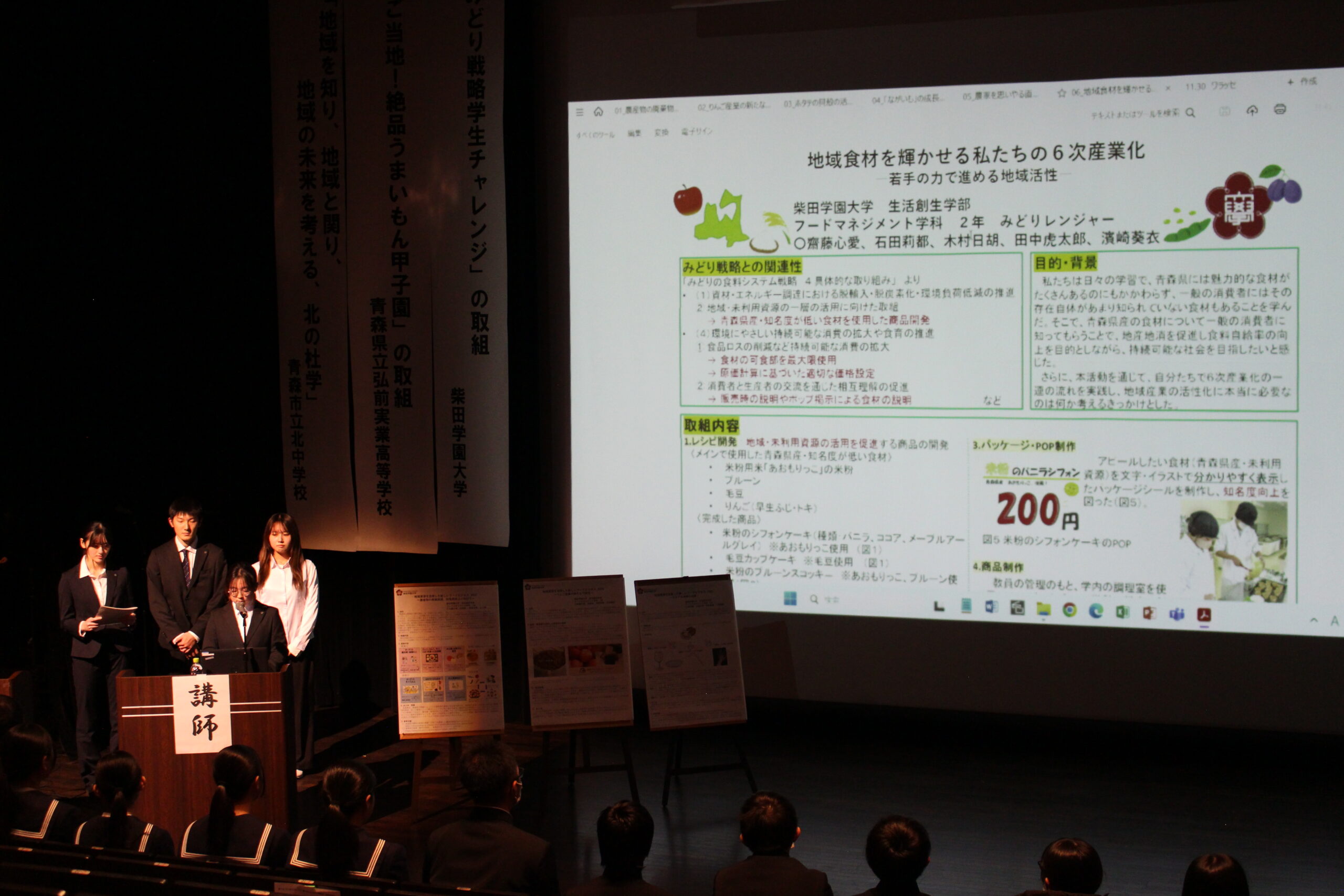「第2回食べる・たいせつフォーラム」(共催:青森県生活協同組合連合会・東北農政局青森県拠点)が11月30日(日)、青森市文化観光交流施設ねぶたの家「ワ・ラッセ」で開催され、フードマネジメント学科1・2年生の6グループの学生が、「みどり戦略学生チャレンジ」の取組と題し実践報告をしました。各グループの報告タイトルは次のとおりです。